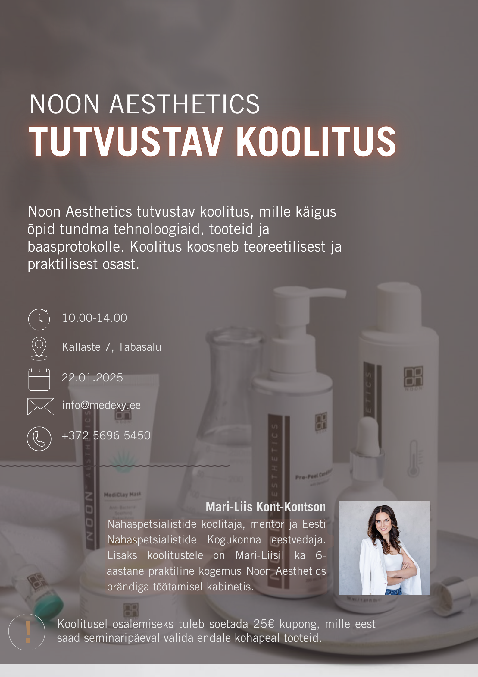 Lisaks tootekoolitusele keskendume praktilisele poolele – kuidas integreerida Noon Aesthetics hooldused oma ilusalongi või kliiniku teenuste valikusse. Koolitus sobib suurepäraselt kosmeetikutele, esteetikutele ja nahahoolduse spetsialistidele, kes soovivad täiendada oma teadmisi ja pakkuda klientidele tõeliselt uuenduslikke lahendusi.