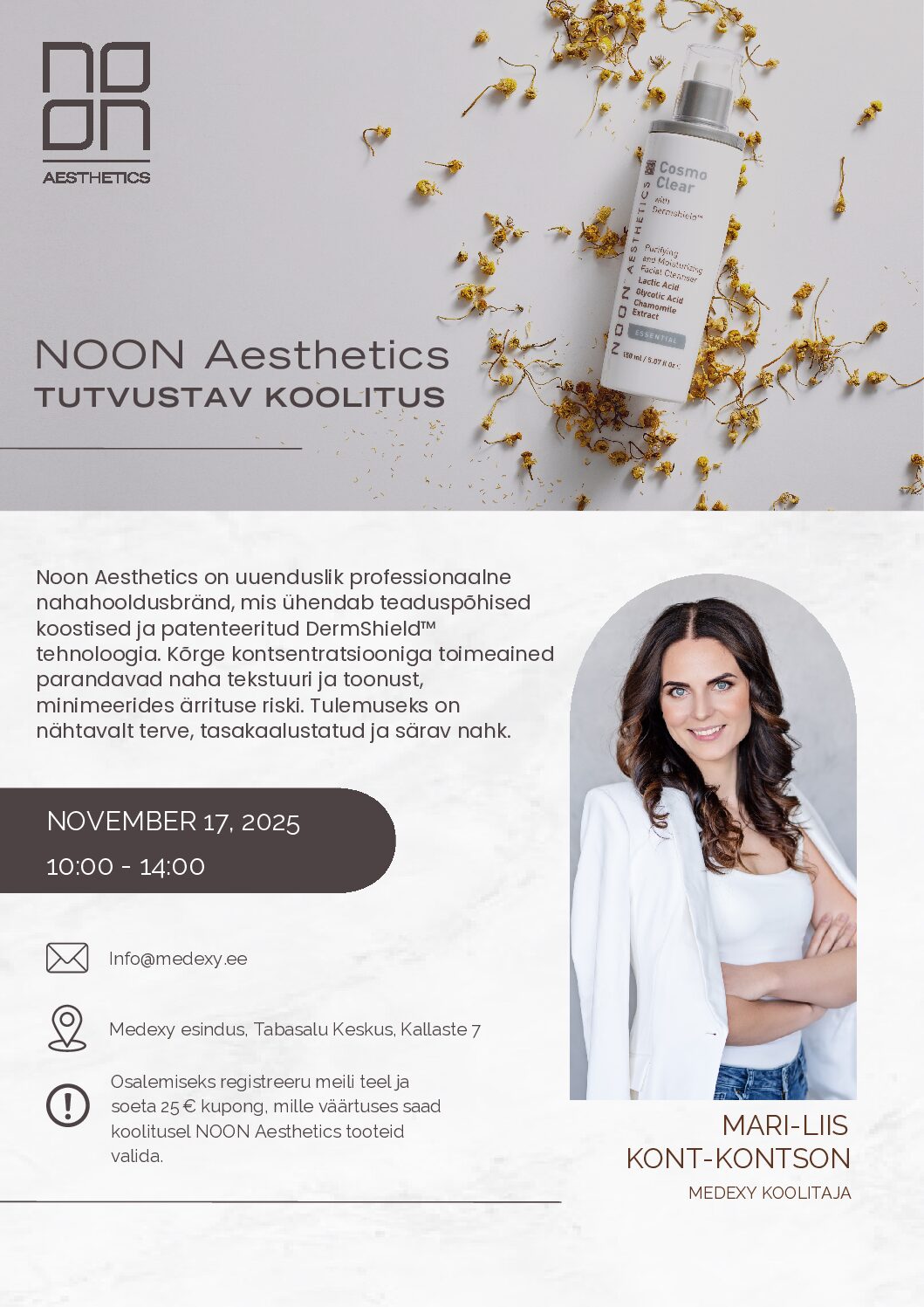Oled oodatud osalema põneval ja harival Noon Aesthetics tutvustuskoolitusel, mis toob sinuni ühe professionaalse esteetikamaailma kõige uuenduslikuma ja teaduspõhisema brändi. Noon Aesthetics on tuntud oma erakordselt tõhusate ja nahasõbralike hoolduste poolest, mis ühendavad tipptasemel tehnoloogia ja kõrgekvaliteedilised koostisosad, et pakkuda muljetavaldavaid tulemusi erinevate nahaprobleemide korral. Brändi südameks on patendeeritud DermShield™ tehnoloogia, mis võimaldab kasutada kõrge kontsentratsiooniga toimeaineid ilma tavalise ärrituse ja kõrvaltoimeteta – see tähendab, et tulemused on kiiremad ja nähtavamad, säilitades samal ajal naha mugavuse ja turvalisuse.